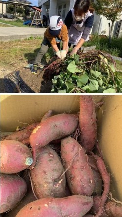 中津市蛎瀬にある「福祉の里センターサマリア館」内の「児童発達支援・放課後等デイサービスマルコ」でさつまいもの収穫をしました。 力を合わせて「うんとこしょ・どっこいしょ」今年も大きな芋が掘れました。掘れた芋を使っておやつ作りを行う予定です。