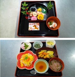 2026年1月1日(木)は「特別養護老人ホームいずみの園」の朝食はおせち料理でした。お屠蘇と一緒に召し上がっていただきました。1月2日(金)の昼食はちらし寿司でした。