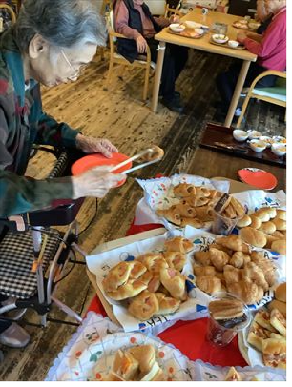 小規模多機能型居宅介護事業所「寄り合いセンターいずみ」でパンバイキングを行いました。 自分の好きなパンを好きなだけ選び、シチューと共に頂きました。