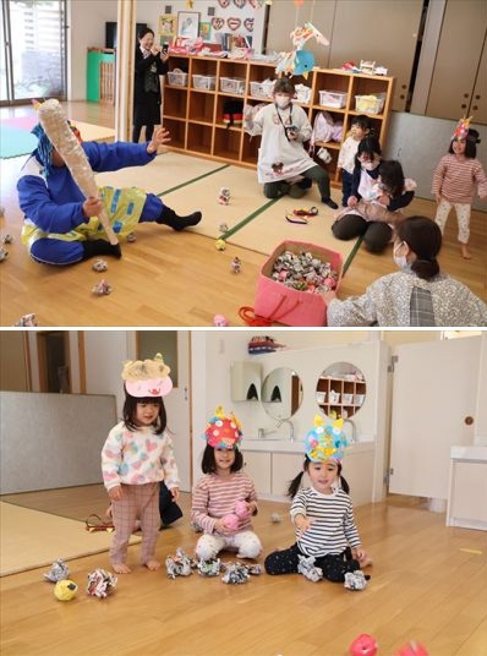 2月2日(月)、事業内保育施設「マリアガーデン」では節分の豆まきを行いました。 今年は職員が扮する青鬼が来ると、子どもたちはびっくりして泣いてしまいましたが、豆を投げることができました。