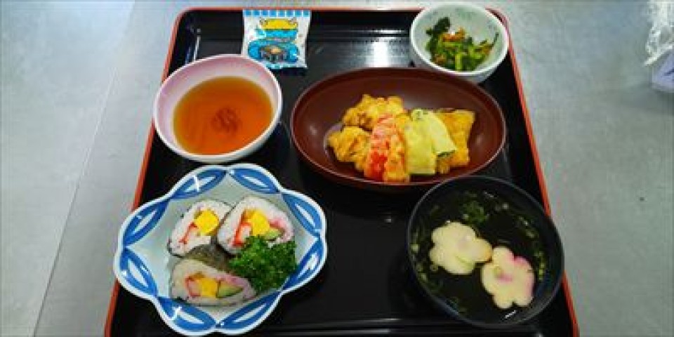 2月3日(火)「特別養護老人ホームいずみの園」の昼食は節分の行事食でした。 メニューは巻き寿司、天ぷら盛り合わせ、春菊のお浸し、清汁、福豆ボーロです。