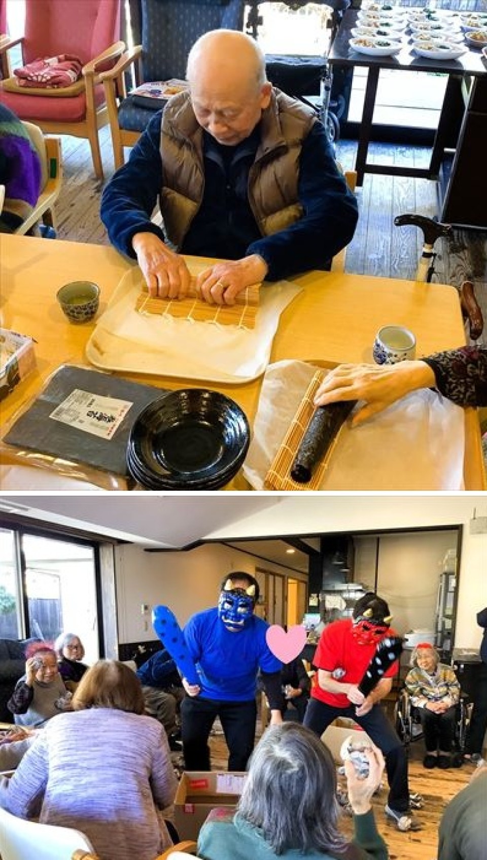 2月3日(火)小規模多機能型居宅介護事業所「寄り合いセンターいずみ」で節分の行事を行いました。 ご利用者の皆様と恵方巻きを作りました。ご自身で巻きすを広げ、海苔の上にご飯や具材をのせて巻きました。ご利用者の皆様も南南東に向かって美味しくいただきました。 午後からは豆まきを行い、今年一年の福を願いました。
