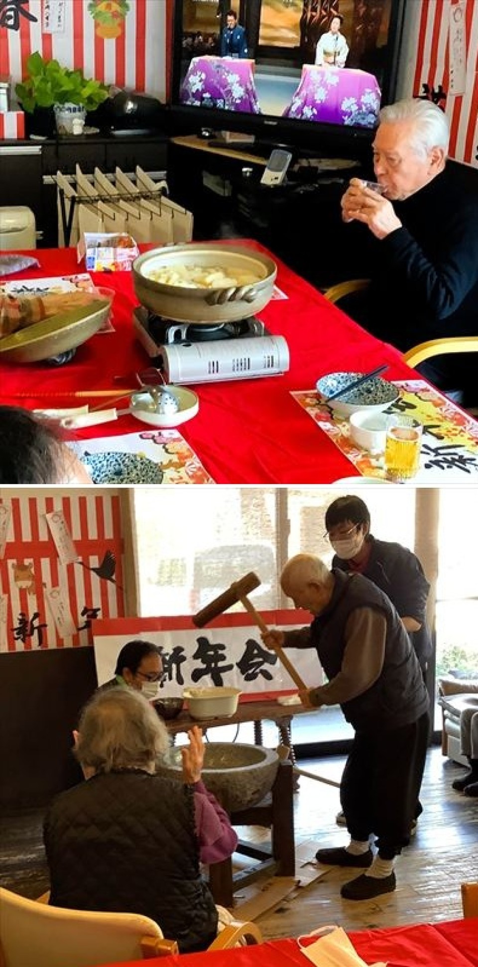 小規模多機能型居宅介護事業所「寄り合いセンターいずみ」で1月下旬に温かいお鍋を囲み、新年会を行いました。 ご利用者の皆様も温かいお鍋に身も心も暖かくなり、「美味しい」との感想をいただきました。 午後からは毎年恒例の餅つき大会を行い、つきたてのお餅をぜんざいにして召し上がっていただきました。