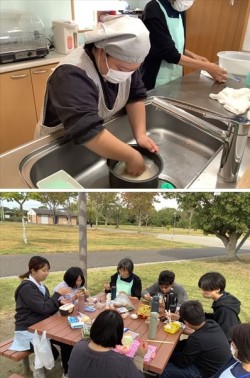 11月4日(火)中津市蛎瀬にある「放課後等デイサービスマルコ」でお弁当作りのあと、散策に出かけました。 お米研ぎに始まり、卵料理・ウインナー炒め・おにぎり作り等、「ウインナーは一本のまま」「目玉焼きが作りたい」と、思い思いにフライパンと向き合う子供達。洗い物にも意欲的にチャレンジ! 公園でのお弁当は「美味しい」とついついお代わりのおにぎりに手が伸び、お腹いっぱいに。 食後は、米山公園でどんぐり拾いに薦神社の菊花展!神社内を散策と、いっぱい食べて、いっぱい歩いて楽しい一日となりました。