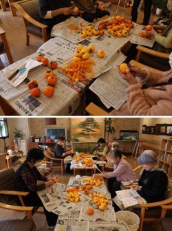 11月17日(月)「ケアマンション聖愛ホーム」で干し柿作りをしました。 ご入居者の皆様と一緒に柿の皮を剥きました。ご入居者や職員も干し柿の完成を楽しみに待っています。