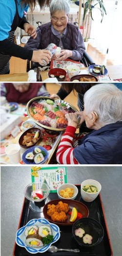 12月19日(金)「シニアレジデンスいずみの森」でクリスマス祝会・愛燦会を行いました。 色とりどりの食事に舌鼓を打ち、お酒やケーキも召し上がり、サンタクロースからのクリスマスプレゼント、ボランティアの方と一緒に歌ったりと、楽しい時間を過ごしました。