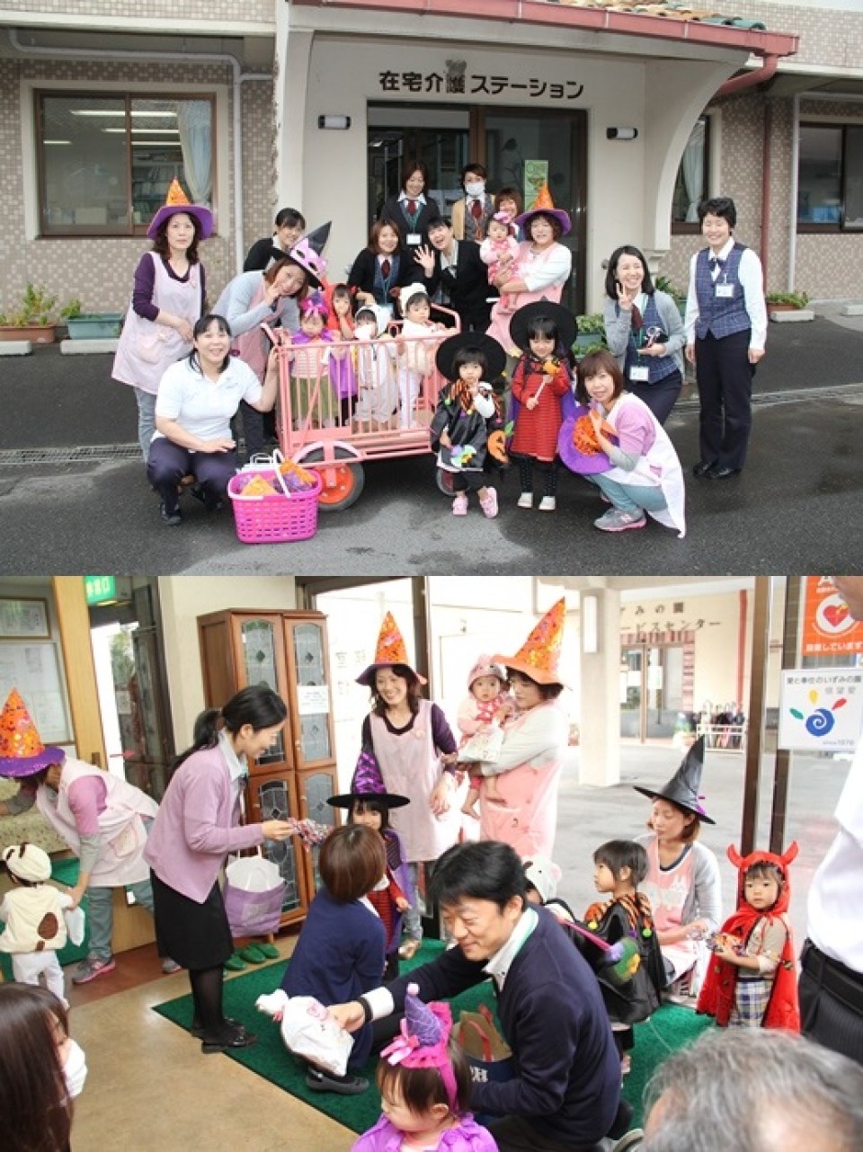 10月31日(金)に事業所内保育施設「マリアガーデン」でハロウィンパーティーを行いました。 何日も前から『今日はハロウィン?』と、ハロウィンパーティーを心待ちにしていた子どもたち、当日は保護者の方に衣装の準備をお願いして、今年も個性あふれる、可愛い仮装ができました。 朝から元気いっぱいで最初の訪問先、在宅事業部(介護保険センター、地域包括支援センター、ヘルパーステーション、訪問看護ステーション)に到着すると、カメラとお菓子を持って待ち構えていた職員のあちこちから『可愛い〜』という声が聞かれました(写真上)。一番大きなお友達が『お菓子をくれないと、イタズラするぞ〜』というと、用意していたお菓子を子供たちに配ってくれました。子どもたちも、『ありがとう』と嬉しそうでした。 この日は午前中だけで8か所の事業所を回り、たくさんのお菓子をもらった子どもたち、各事業所のご利用者や職員とも交流が出来、とても楽しい一日になったようです。 写真下:総務部での様子 (マリアガーデン) |