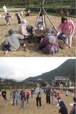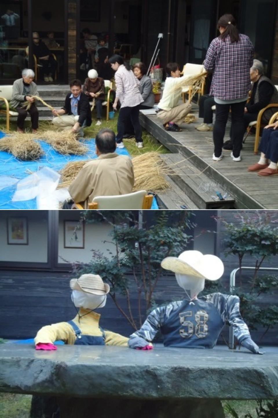 11月6日(木)、午後「かきぜグループホーム」の中庭で、「寄り合いセンターいずみ」・「かきぜグループホーム」のご利用者26名が、見学や作業を交代しながら、職員と案山子作りを行いました。 最初はスタッフの作る姿を見学するだけでしたが、「ちょっと、貸してみない」と一人が作りだすと、各自が藁を手に取りだし、縄を編んだり、しめ飾りを作ったりと、“昔取った杵柄”なのでしょう、生きいきとした表情や手際の良さに驚かされました。 日差しの暖かな午後の昼下がりに、ゆったりとした時間が流れていました。 写真上:作業風景 写真下:完成した案山子 (寄り合いセンターいずみ)