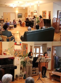 10月30日(木)、15時から「グループホーム べテルハウス」のリビングにおいて、フルート・オカリナコンサートが行われました。 地域の方がお二人で訪問して下さり、ご利用者がお好きな唱歌や秋の歌「小さい秋みつけた」をフルートとオカリナのデュエットに、参加された9名のご利用者も、手拍子や口ずさみながら演奏を楽しまれていました。 このコンサートは昨年11月より行われ、今回で5回目となりましたが、ご利用者は大変喜ばれていました。 (グループホーム べテルハウス)