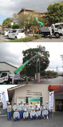 「株式会社 九電工 中津営業所」様では、社会貢献活動・環境活動として、毎年10月下旬を「さわやかコミュニティ旬間」として取り組まれています。 10月14日(火)午後、工藤芳隆所長の計らいにより、20名を超える所員の方々が「いずみの園」へ来園し、手の届かない高所の庭木を剪定して頂きました。 木々は数年ぶりに剪定され、サッパリと周りが明るくなりました。 九電工グループでは、期間中は高所作業でのノウハウを活かした清掃作業や、福祉施設の設備点検作業など、グループ全社で地域社会に根ざした奉仕活動を実施されています。また、この取り組みは2010年度より取り組まれ、九電工グループの社会貢献活動の中核となっているとのことです。 中津営業所の皆様に感謝申し上げます。 (総務部管理課)