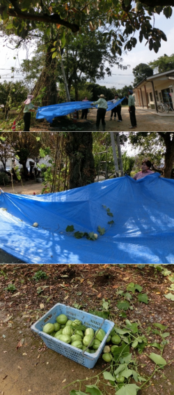 10月27日(月)10時より「多機能型事業ワークセンター シャローム」の農作業班、就労継続支援B型のご利用者4名と職員3名で隼人瓜(ハヤトウリ)を収穫しました。 隼人瓜はつる性の植物でお漬物や炒め物、煮物などにして食すと美味しいお野菜です。 「シャローム」の敷地内にある高さ20メートル程の木に巻きついた瓜を、職員が梯子と長い鎌を使い切り落とし、下では皆でシートをはって受け止めました。(写真上・中) 落ちてくる所が定まっていないため、とても苦労しましたが、皆のチームワークで見事に80個の立派な隼人瓜を収穫ですることができました。(写真下) 収穫した瓜は、「いずみの園」の職員向けに販売しています。 (ワークセンター シャローム)