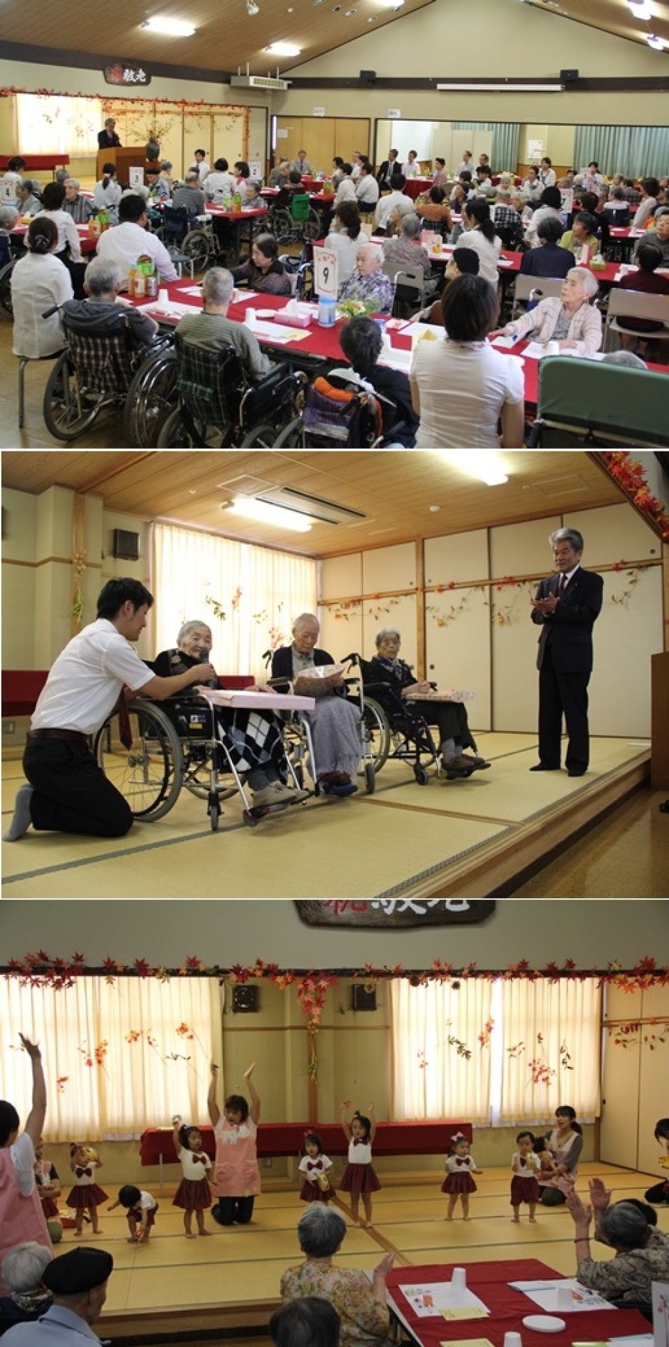 9月11日(木)11:00より、「地域交流ホームいずみ館」にて、「特別養護老人ホームいずみの園」の敬老祝会が行われ、特養のご利用者が参加されました。(写真上)〔特養100名 平均88.2歳 80歳未満10名、80歳台39名、90歳台48名、100歳台3名〕