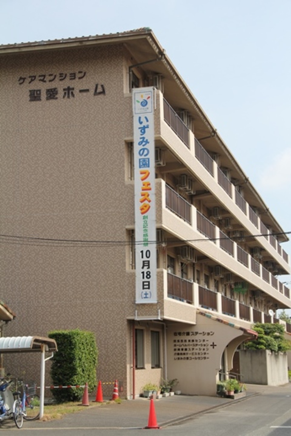 この「いずみの園フェスタ」の大型垂れ幕が、「ケアマンション聖愛ホーム」4階から掲げられました。
