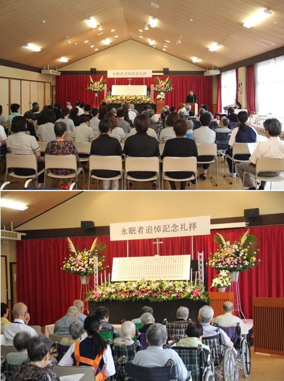 8月12日(火)10:30より、いずみの園のご利用者で、この一年間にお亡くなりになられた方の「永眠者追悼記念礼拝」が「地域交流ホームいずみ館」においてキリスト教式で行われました。 ご家族の方、特別養護老人ホーム・聖愛ホームのご利用者、職員の方など、合わせて約80人の方が参加されました。 司式は当園の堤チャプレンが行いました。 参加者全員で讃美歌の合唱を行い、旧約聖書 詩編102:24−28の朗読、また「時と永遠」と題して説教が行われました。 その後祈祷、讃美歌合唱を行い、故人を偲び記念礼拝を終えました。 最後に当法人理事長から、1年間に亡くなられた故人を偲んでの挨拶で追悼式を終了しました。 (経営企画室:編集担当)