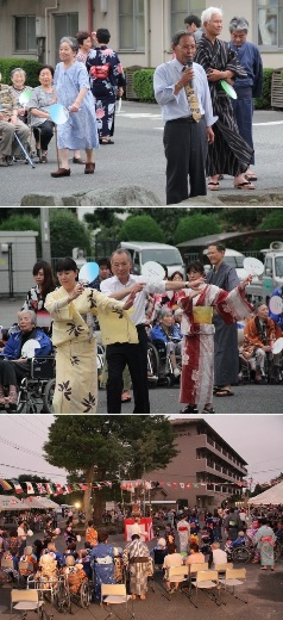 8月16日(土)18:30より、「中津総合ケアセンターいずみの園」の玄関前広場にて、恒例の永添上ノ原地区といずみの園「合同慰霊盆踊り」が行われました。 14時から地区の皆さんと当園職員で、慰霊祭壇の設置や櫓立てなどの会場設営を行いました。 天候は雨模様で心配しましたが、18時30分から盆踊りを開会、まず5曲踊ったあと、末廣区長、冨永理事長、新貝中津市長の1年間で逝去された方々への弔慰などのあいさつがありました。(写真上・区長) なお、市長ご夫妻は開会時から最後まで、踊りの輪に加れるなど、くつろいでいただきました。(写真中・新貝市長) 中津音頭や炭坑節などおなじみの曲を踊り、初めは小さかった盆踊りの輪は、地区の皆さんやご利用者も踊りに参加され、次第に大きなものとなりました。(写真下・特養利用者等) 花火の打ち上げ、プレゼント抽選会で「盆踊り大会」は閉会となりました。今年も、地区の皆さんのご協力で盛大に盆踊り大会を行うことができました。ありがとうございました。 (特養事業部 相談課)
