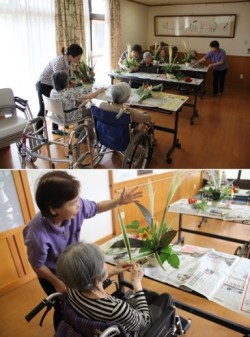 「特別養護老人ホームいずみの園」では、月に2回、第2・第4月曜日の午前中に「生花クラブ」を行っています。 8月11日(月)の「生花クラブ」は、特養ヨハネ館多目的ホールにて、生花店の方をはじめボランティアの方と一緒に、特養ご利用者と職員で生け花を行いました。 今回は、立秋を迎えたこの時期から秋にかけて白銀の羽毛のような花穂をつける『パンパスグラス』というお花を使ってきれいに生けることができました。 出来上がった生け花の鉢は、園内のホールに飾られます。皆さんの癒しになればと思います。 (特養事業部介護課)