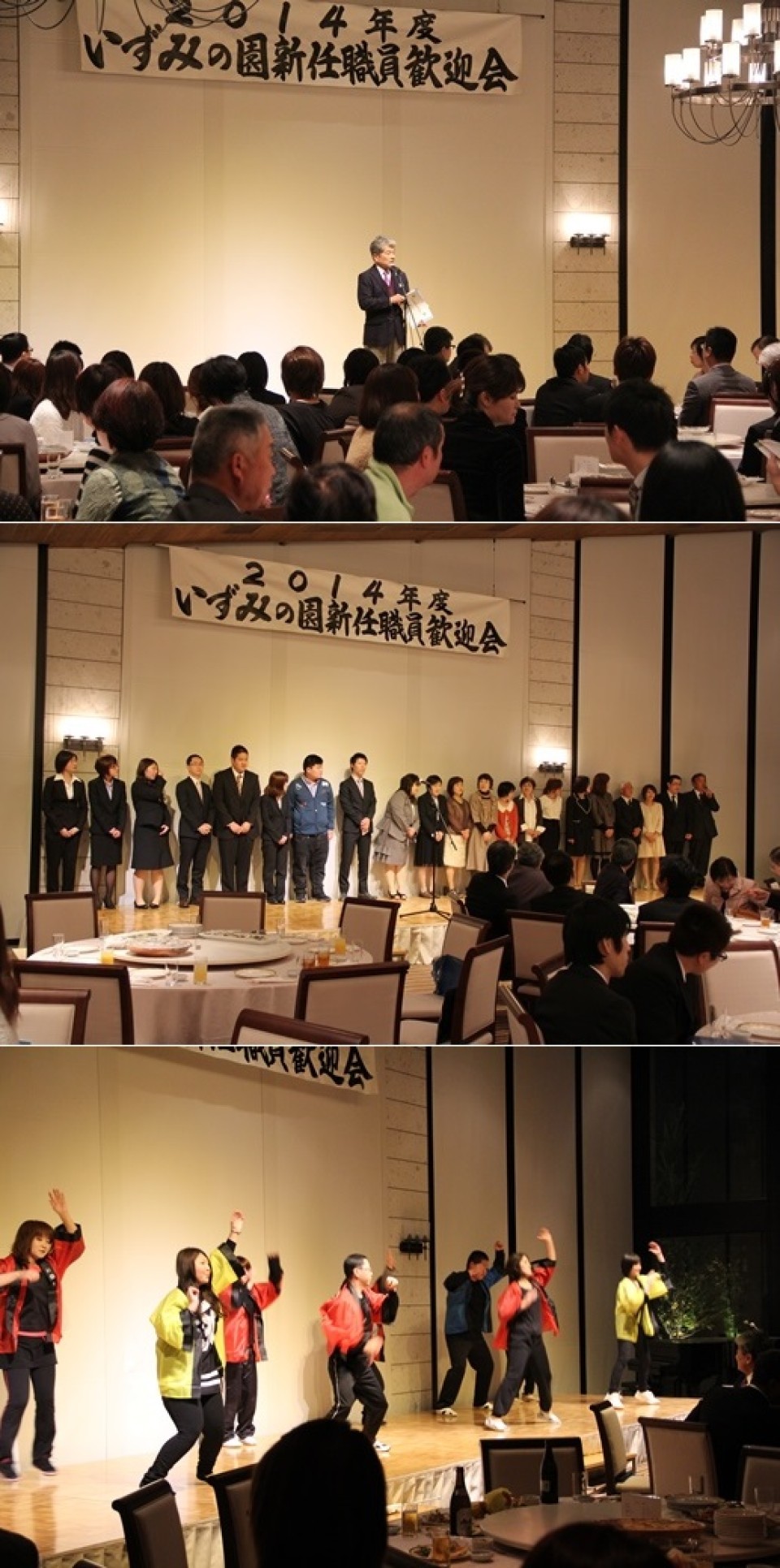 4月18日(金)19:00より、中津市内の催場において、「いずみ会(職員親睦会)」主催の『2014年度 いずみの園 新任職員歓迎会』が行われました。 当日の出席者は、業務で出席できない人を除き、247名が参加しました。 まず冨永理事長より「これからのいずみの園の発展は、皆さんの頑張りにあります。新人がいずみの園に入って良かったと思えるようにしていきましょう。今日は新人を囲んでゆっくりと杯を交わしましょう。」と挨拶がありました(写真上)。 次に、昨年12月以降に入職した21名の職員が壇上に紹介され(写真中)、一人ひとりの挨拶があり、先輩職員からそれぞれ花束が手渡されました。 その後約2時間30分にわたり、新任職員による踊り(写真下)や、部署対抗カラオケ大会など、楽しいひと時を過ごしました。 (いずみ会) |