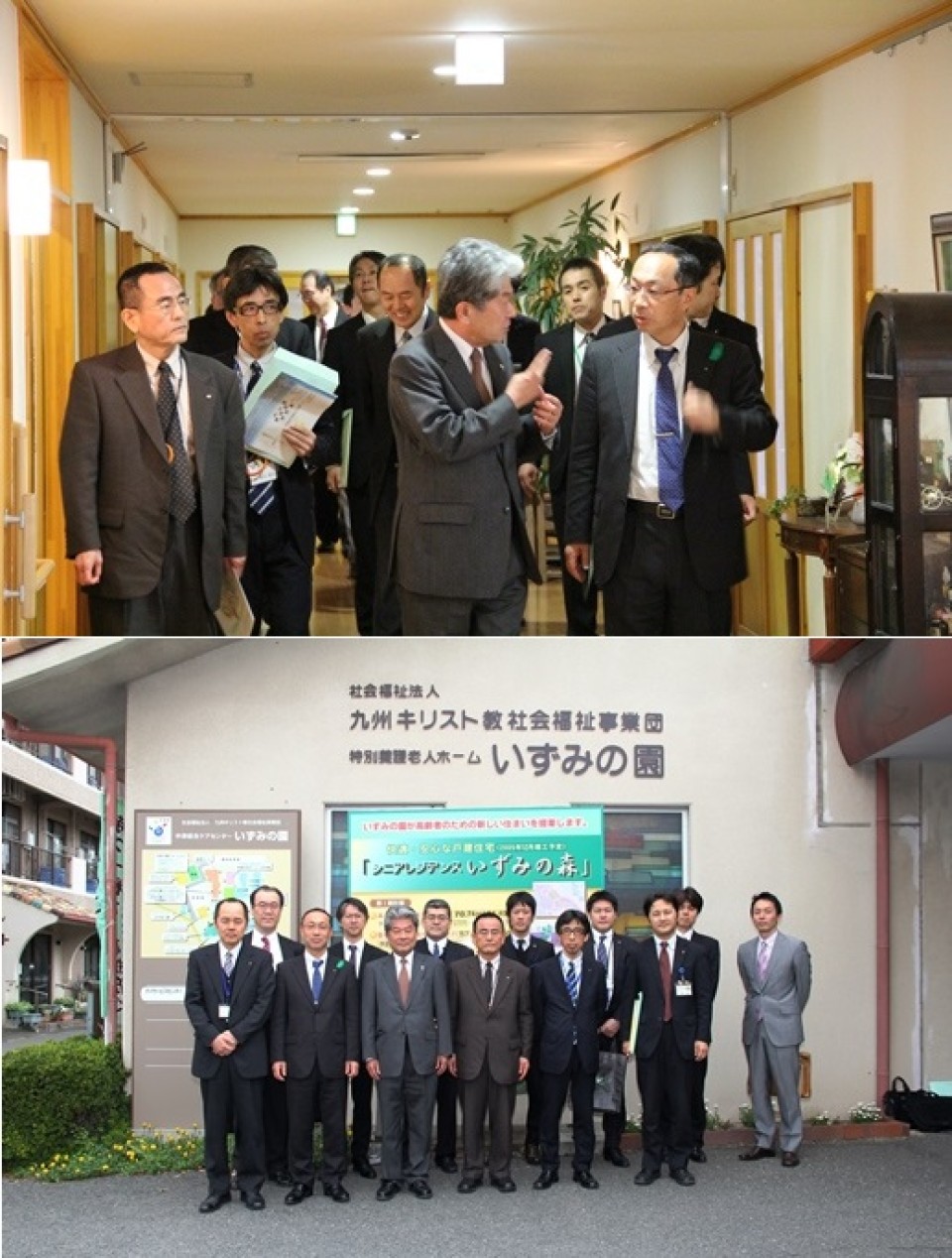 4月21日(月)、大分県福祉保健部の草野審議監、池永参事監、飯田高齢福祉課長外9名の方と総務部財務課の3名の方が当法人へ来園されました。 草野審議監から卒直な意見交換の場としたい旨のご挨拶があり、当法人からは冨永理事長が法人の沿革や経営方針など全体の概要を述べ、障がい就労継続事業のスタート1年の取組状況、特養における介護の状況、24時間サービスの実績やかきぜサポートセンターでの新規事業構想などについて担当部次長から説明をしました。 その後、ユニット型特養や24時間サービスコールセンター、ワークセンターシャロームおよびかきぜの小規模多機能型居宅介護・グループホームを見学いただきました。(写真上・下) 福祉保健企画部や高齢者福祉課の課長補佐や総務部の予算班主幹の方も福祉の現場の一端に触れていただき、今後の県の福祉行政に活かして いただければ、大変ありがたいと存じます。 お忙しい中、また朝の3時間を、いずみの園を見学いただきましたが、引き続き審議監外8名の方は県北の他の事業所見学のため、次へと移動されました。お疲れさまでした。 (研修センター) |