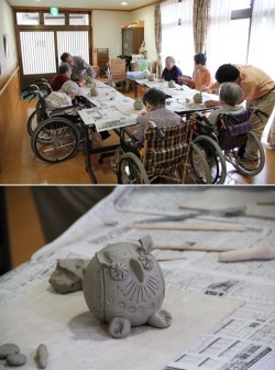 「特別養護老人ホームいずみの園」では、毎月1回陶芸教室を行っています。中津市内にある「かっぱ工房」の方1名がボランティアで講師として来園され、ご利用者へ陶芸の指導を行っています。 4月は30日(水)15:00より、特養ヨハネ館多目的ホールにて陶芸教室が行われ、特養ご利用者6名の方が参加され、職員1名が手伝いをしました。 今回は、フクロウの置物作りで、講師の方に丁寧に指導して頂き、土をこね、約1時間後それぞれ個性のある作品が出来上がりました。 出来上った作品は、講師の方が持ち帰り、乾燥、素焼き、色付けなどをして、次の陶芸教室には出来上がりの作品が届けられます。 (特養事業部介護課) |