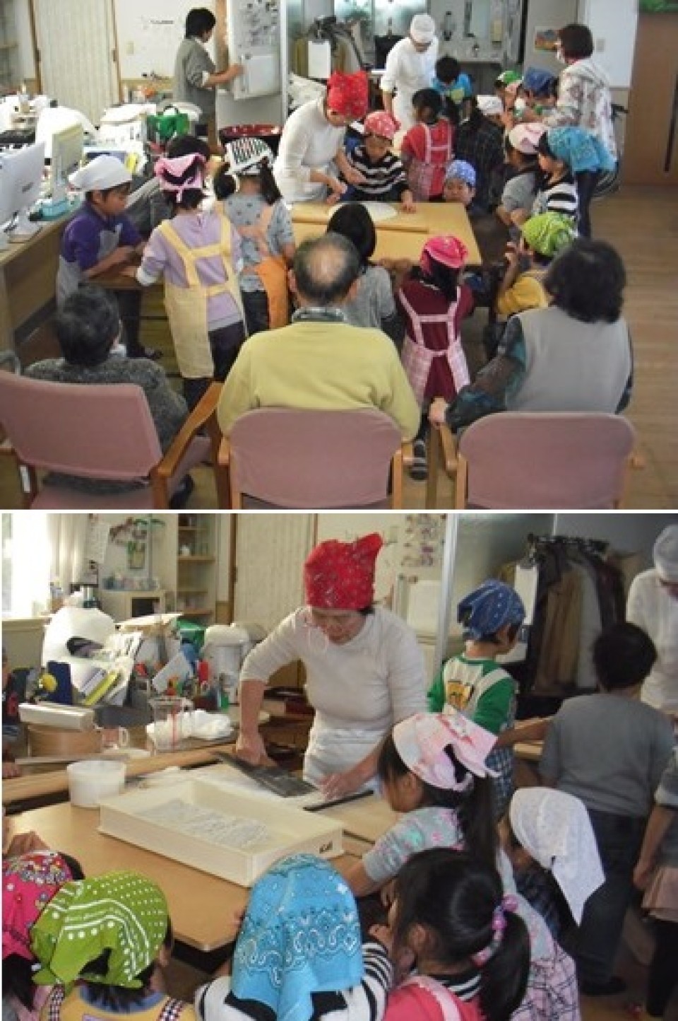 以前デイサービスを利用されていたご利用者のご家族の方が来園し、そばを打って下さり、「児童クラブピーター」の児童も参加しました。児童たちは、そば粉をふるいにかけ、水を加えながら捏ねたり、大きな包丁を持ってそばを切る等真剣な表情で見ていました。そばが出来るまでの工程を見てご利用者・児童共に「すごいなー」「楽しい」など明るい声が多く聞かれました。