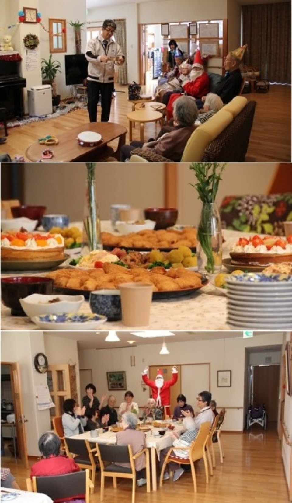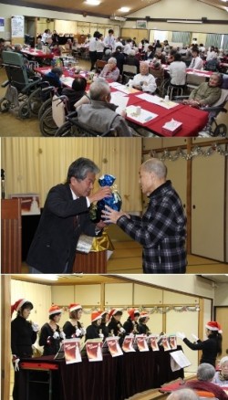 「特別養護老人ホームいずみの園」では毎年クリスマス時期に「クリスマス祝会」を行っています。今年は12月20日(金)の16:30より、「地域交流ホームいずみ館」で行われ、特養とショートステイのご利用者、計64名が参加されました(写真上)。