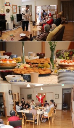 昼食は手作りで、ご利用者のご家族の方も昼食作りを手伝って下さり、クリスマスメニューが完成し(写真中)、ご利用者、ご家族の方、職員で一緒に頂きました(写真下)。