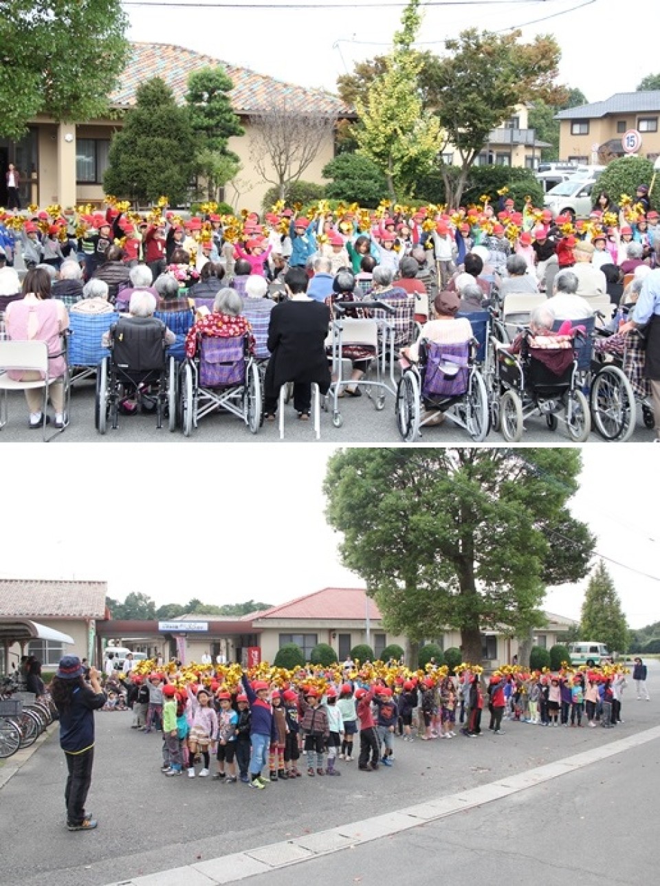 11月6日(水)、「いずみの園」の近隣にある中津市立大幡小学校の児童がいずみの園へ慰問に来られました。 大幡小学校からは毎年この時期に「いずみの園」へ慰問に来られており、今年も1年生の127名の児童が、玄関前の広場で歌とダンスを披露してくれました。 少し肌寒くなった気候でしたが、「特別養護老人ホームいずみの園」のご利用者の他、「デイサービスふれんど館」、「グループホームベテルハウス」、「ケアハウス聖愛ホーム」合わせて60名以上のご利用者が集まり、児童の元気のいい歌とダンスを、目を細めて見られ、拍手が沸き起こりました。 小学生の皆さん、ありがとうございました。 (経営企画室:編集担当) |