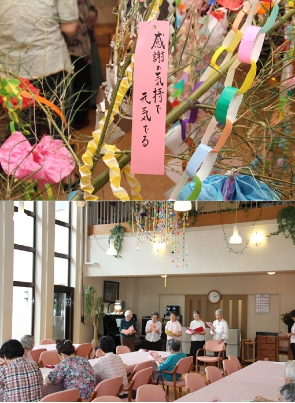 7月5日「ケアマンション聖愛ホーム」で、ご利用者15名,職員5名で七夕会を行いました。 職員から、七夕の由来について(中国に女子の裁縫の上達を願うお祭りが、日本の神様へ捧げる衣を織る「棚機女(タナバタメ)」に結びついて、現在の七夕になったとされています。)の説明後、「たなばたさま」や「世界は二人のために」等、七夕にぴったりな歌を歌いました。 その後、ティータイムでくずもちを食べました。「笹の葉の香りがいいですね。」と喜ばれていました。 みなさん、織姫と彦星の再会を願いながら、七夕会を楽しまれていました。 (ケアマンション聖愛ホーム)