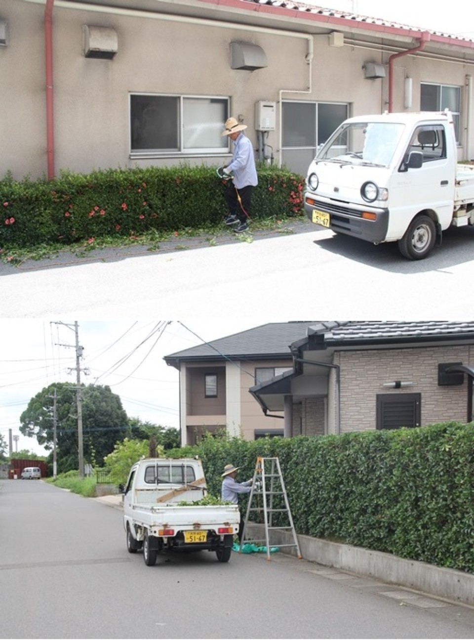 いずみの園の敷地内には、たくさんの木や花が植樹されています。 新緑が過ぎたこの時期、総務部管理課の庶務係に所属する職員が、園内の環境整備に汗を流しています。 庭木の剪定などの環境整備だけでなく、車椅子の修理、これからの季節ではグリーンカーテンの準備等、まさに「縁の下の力持ち」として、いずみの園を支えてくれています。 熱中症にならないよう、頑張ってください! (経営企画室:編集担当) |