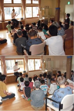 かきぜサポートセンター内にある、「放課後児童クラブピーター」では、聖愛ホームホーム長の堤チャプレンによる、礼拝を毎月1回開催しています。 今月は7月5日金曜日に行い、讃美歌を一緒に歌い、お祈りをして、体に障害を持った方のエピソードを聞きました。 「デイサービスかきぜ」、「かきぜグループホームけやき・いちょう」の高齢者も一緒に参加し、チャプレンのお話を真剣に聞かれていました。