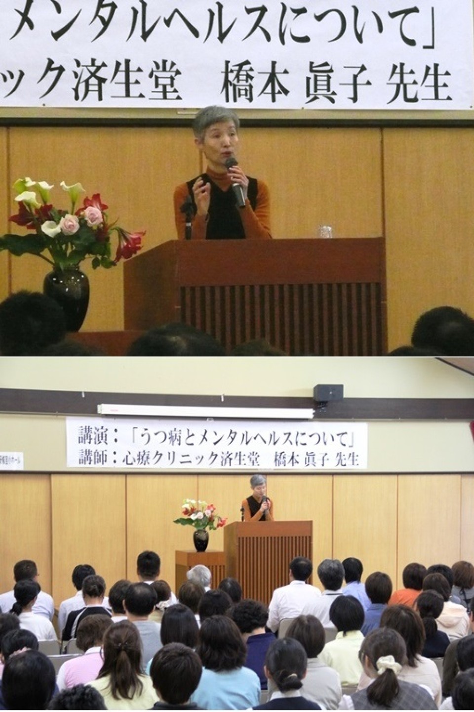 5月21日(火)18:30より「地域交流ホームいずみ館」にて、本年度第1回目の園内研修が行われました。 今回は、「心療クリニック済生堂」の橋本眞子医師により『うつ病とメンタルヘルスケアについて』と題し、一般的な医学用語をわかり易く丁寧に説明して頂きました。うつ病について、とても興味深く聞き入ることができました。 うつ病とは『心の風邪』で、誰でも起こりうる病気だということ、予防を図る為にはメンタルヘルスケア【心の健康】が重要だと教えて頂きました。『心の健康』を保つ為には、日々のライフスタイルの見直しや自身の気分転換方法を理解しておく事がポイントだと教えられました。 また、家族や職場の同僚との関わりの中で早期に発見して予防を図る事もできると教えて頂きました。 私達の仕事は、心と体のケアです。介護する私達も健康でなければ仕事を続ける事ができません。今日の講義を聞いて、日々のライフスタイルや気分転換方法を見直し、心身共に健康でよりよいサ−ビス提供が行える様に頑張りたいと思いました。 (研修委員会)