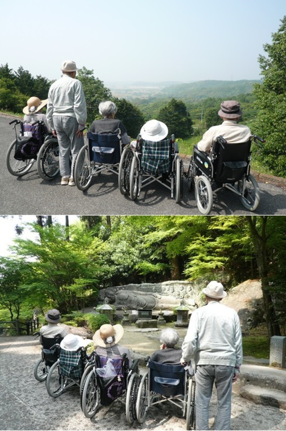 5月21日の午後、「特別養護老人ホームいずみの園」のご利用者5名と職員4名で中津市三光にある八面山まで新緑を見に行きました。 天気もよく車の窓を開けると心地良い風が入り、ご利用者も「出かけるにはこの時期が一番いいね。」といわれていました。 中腹にある駐車場に車を止め、遠くに見える中津市を見下ろしながら、皆で「やっほお〜」と叫んできました。大きな声を出してすっきりした後、近くにある釈迦(しゃか)涅槃像(ねはんぞう)を見に行きました。(高野山真言宗神護寺自然の石を刻んだ像) きれいな空気と新緑に、利用者も職員も心癒された一日となりました。 (特養事業部:介護課) |