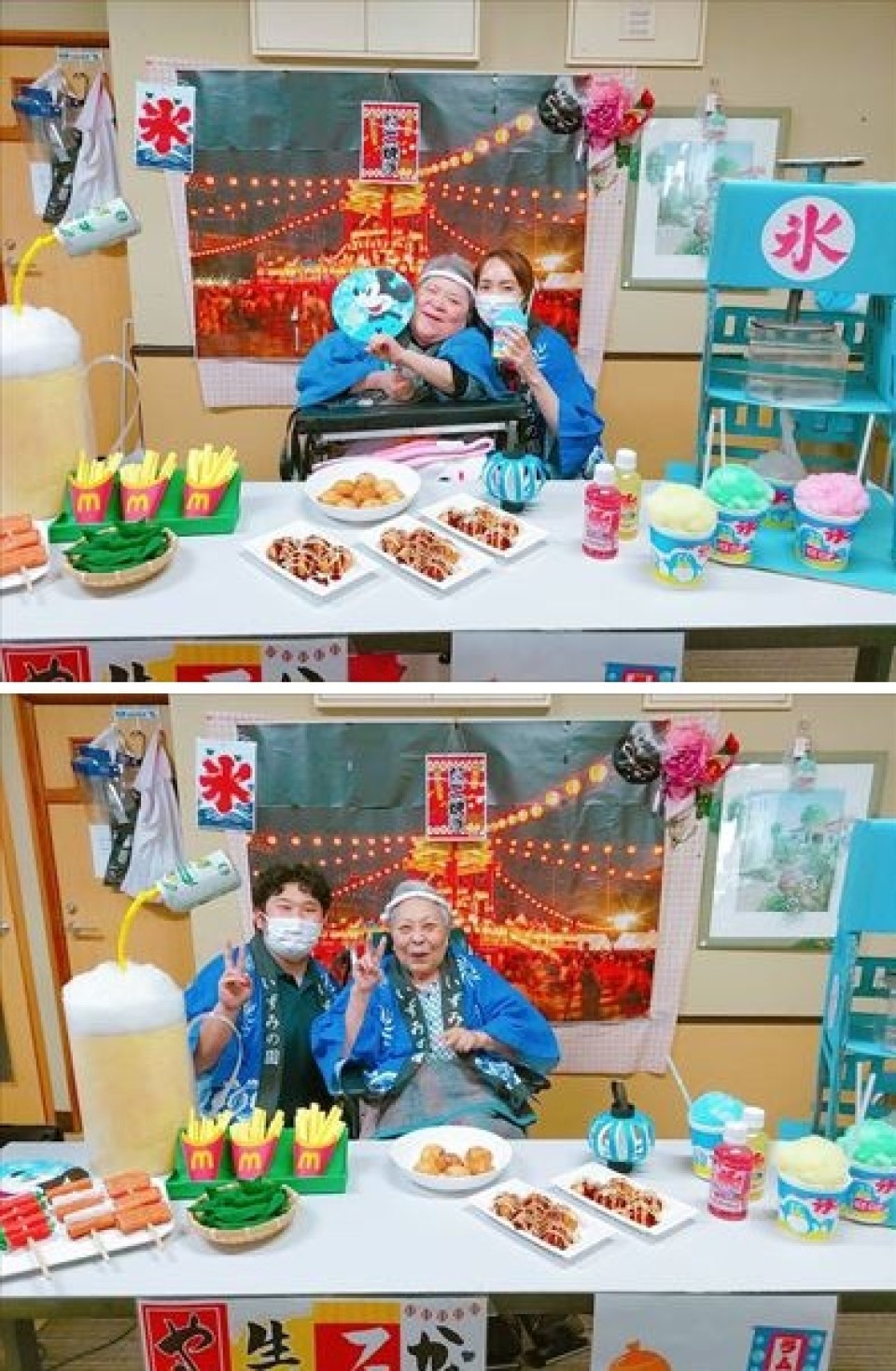 ご利用者や職員も浴衣やハッピを着て、たこ焼きなどを準備しました。ご利用者は「100年ぶりに浴衣着たわ!懐かしい!」と冗談を言われながら、お祭りを楽しまれたご様子でした。