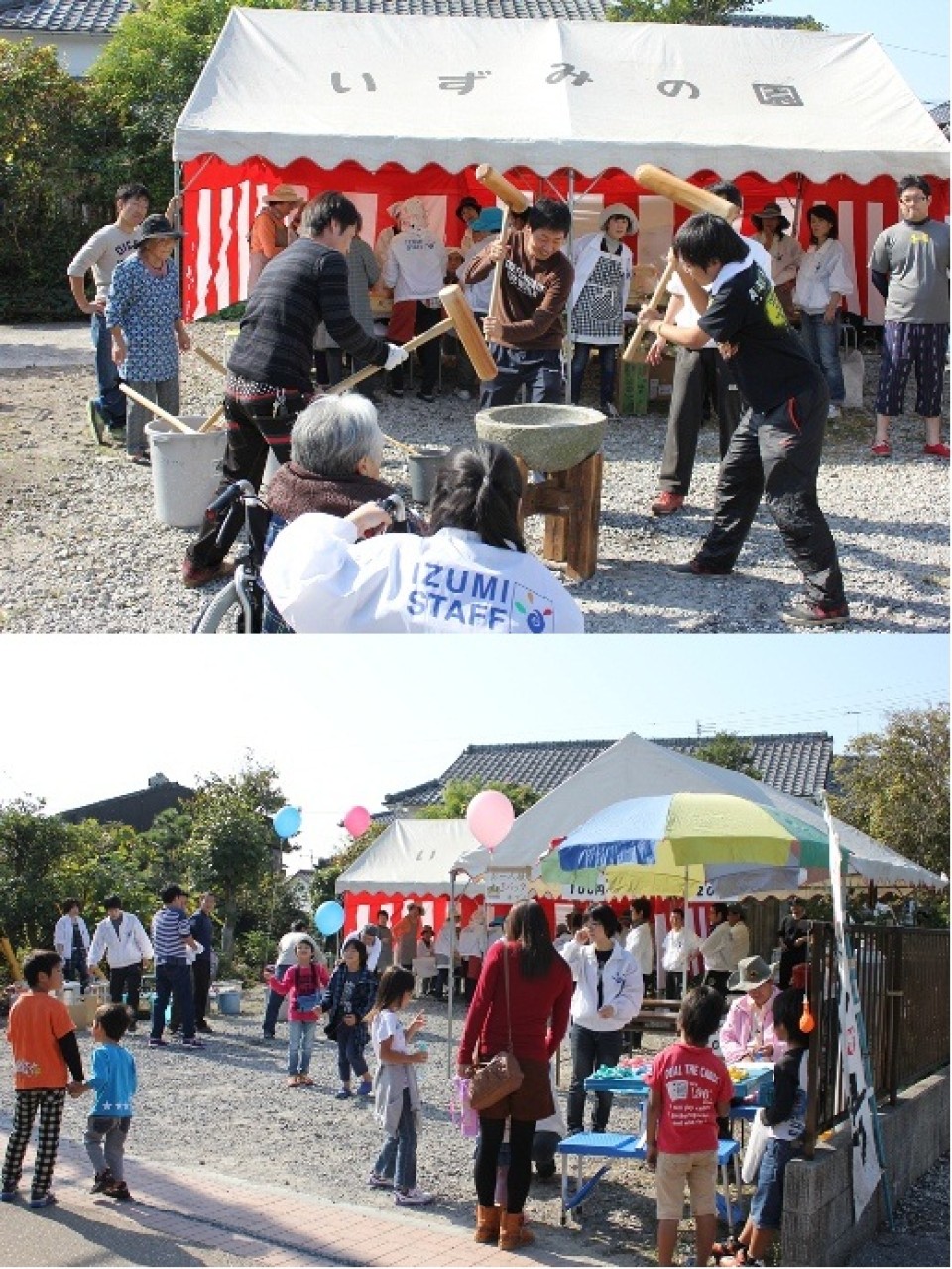 10月21日(日)、「いずみの園かきぜサポートセンター」の近くの蛎瀬、豊後町を通る通称楽一通りで、「楽一通り楽市楽座秋祭り」が開催され、当園も今年で9回目の参加をしました。 朝から晴天で行楽日和のなか、地域の方にお手伝いを頂き、つきたてのお餅の販売、風船の無料配布を行いました。若い職員は餅をちぎったり餅を丸めたりの経験がない職員も多く、地域の方に教えてもらいながら楽しく行っていました。今後も地域の行事に参加し、微力ながらまちづくりの一翼に加わっていきたいと思います。 お手伝いくださったすべての方この場をお借りして感謝申し上げます。ありがとうございました。 (かきぜサポートセンター)