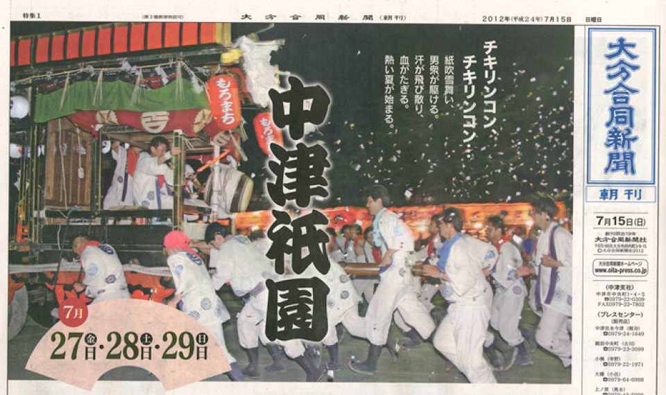 7月27日(金)、28日(土)、29日(日)に毎年恒例の中津祇園が開催されます。 中津祇園は、10万石の城下町中津を代表する祭で、疫病退散と無病息災の祈願を目的に、毎年7月20日過ぎの金曜日から日曜日の3日間行われます。その歴史は古く、580年以上の伝統を誇ります。 12台の祇園車と2基の御神輿が中津の城下町を練り歩き、祇園車の舞台では華麗な民舞等が奉納されます。 大分合同新聞で『中津祇園特集号』が7月15日付けで発行され、いずみの園のPRが掲載されています。PR内容は下からご覧になれます。
