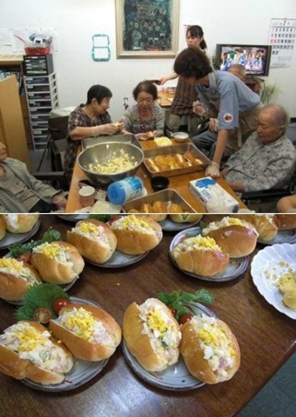 7月22日(日)、「特別養護老人ホームいずみの園」のめぐみ館(本館)1、2番地でご利用者の方々と副食作りを行いました。 今回はサンドイッチ作りで、1番地は14名、2番地は10名のご利用者が参加され、卵の殻をむく方、パンに包丁で切り目をいれる方、パンにポテトサラダをはさむ方、自分の出来る事を手際よく行っていました。皆さん普段とはちがった素敵な表情が見られました。 その後、ご利用者の方々は、自分達で作ったサンドイッチを美味しそうに召し上がっていました。 (特養事業部介護課) |