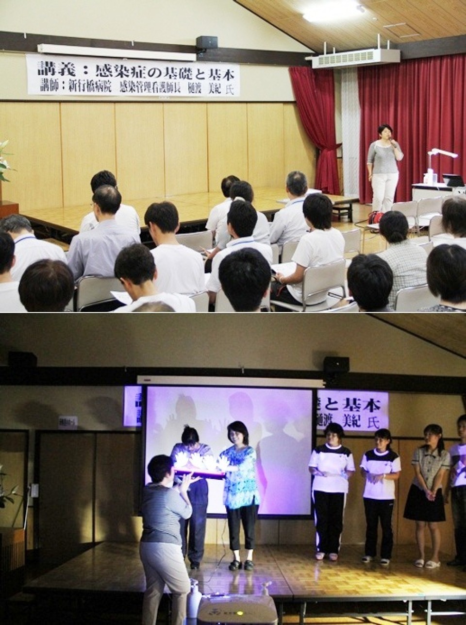 7月26日(木)18:30から地域交流ホームいずみ館で、7月の園内研修があり、151人の当園職員が参加しました。 今回は、福岡県行橋市にある新行橋病院の感染管理看護師長 樋渡 美紀氏をお招きし、「感染症の基礎と基本」と題して研修を行いました。 まず、感染管理の基本的な考え方として、「標準予防策(スタンダードプリコーション)」、接触感染対策の基本は「手洗い」、マスク・ゴーグル・エプロン・手袋の正しい着脱方法などをスライドで説明され、中でも手指衛生の必要性、重要性について詳しく説明していただきました。(写真上) その後、選ばれた職員の14名が、手洗いチェッカーで普段通りの手洗い動作を行い、どれだけ手洗いができているかブラックライト当てチェックを行いました。(写真下) 感染管理について基本に立ち返り再認識することができました。 (研修委員会) |