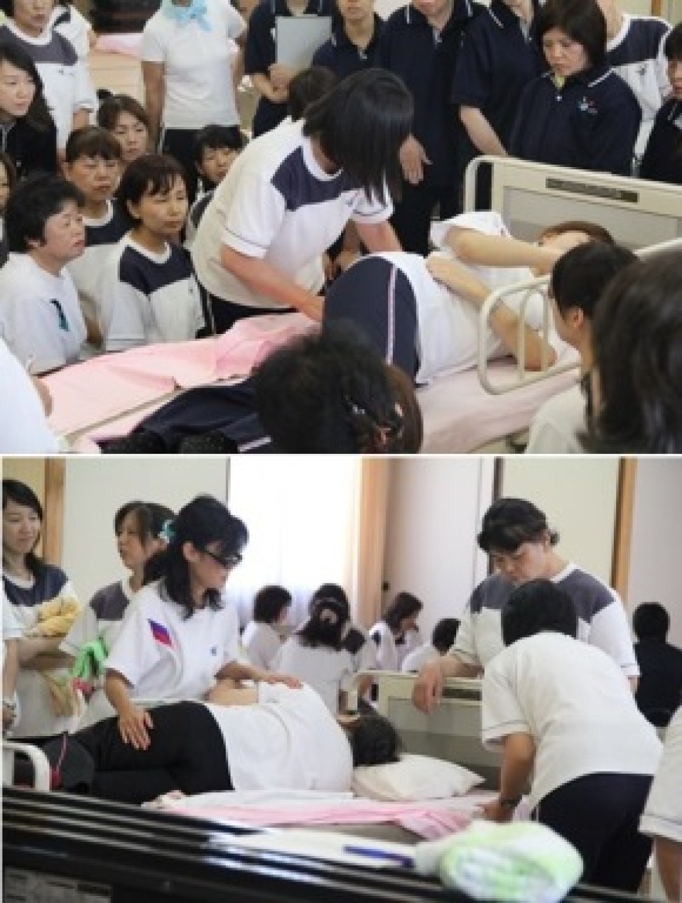 「いずみの園ホームヘルパーステーション」では、毎月1回、第4水曜日にヘルパー全員を対象に介護技術向上、資質向上のためのヘルパー研修を行っています。 7月は24日13:00より「地域交流ホームいずみ館」において、「寝たきりの方へのシーツ交換」と題し実技研修が行われ、80名のヘルパーが参加しました。 先ず、サービス提供責任者が説明、実演し(写真上)、その後6つのグループに分かれ、それぞれ介護者役、利用者役に交代し研修を行いました。(写真下) 夏場は発汗が多く、寝具の交換をすることで、身体の悪化を防ぎ、気持ちの良い睡眠が取れます。寝具交換の多いこの時期のための研修でした。 「いずみの園ホームヘルパーステーション」では、スキルアップと同時に、介護技術の基礎を見直す研修も行っています。 (訪問介護課)