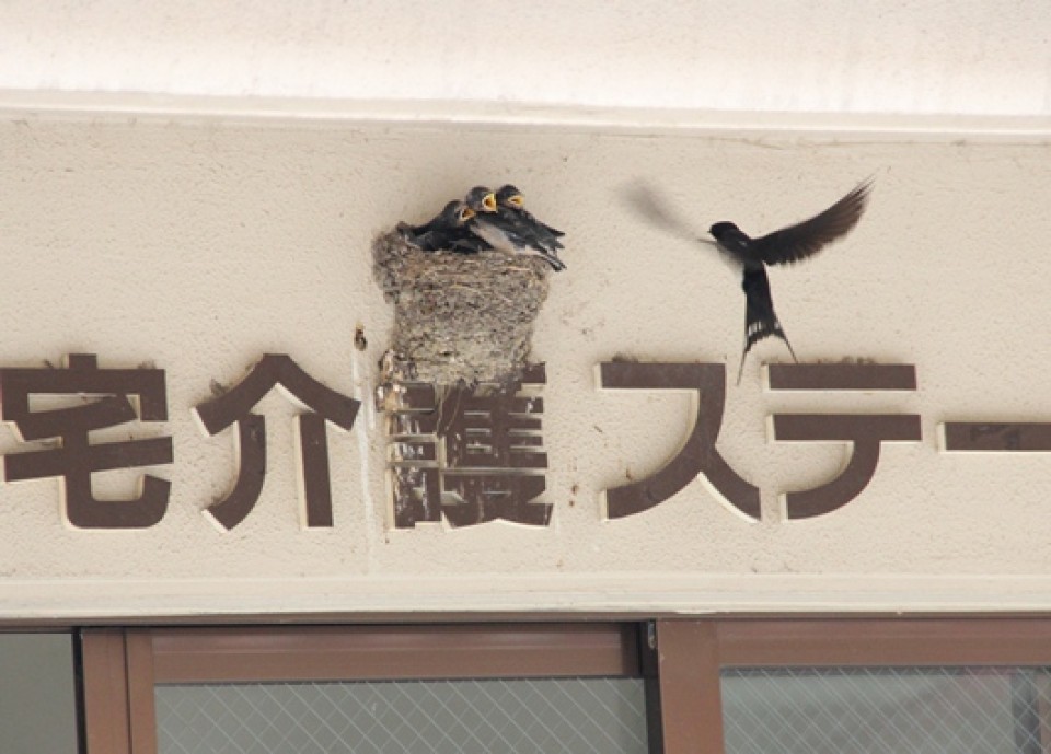 先月お知らせしました、在宅サービス事業部がある事務所玄関の上のツバメの続報です。 6月初めに小さな雛が孵り頭を少し覗かせていましたが、みるみる大きくなり、今では6羽の雛鳥が今にも落ちそうなくらいにぎゅうぎゅうに狭い巣に入っています。 親鳥が餌を運んできた時には、我先にと首を伸ばし、とても微笑ましい光景です。 昨年は6月15日に巣立ちましたが、今年もその日が近づいてきました。 (経営企画室:編集担当) |