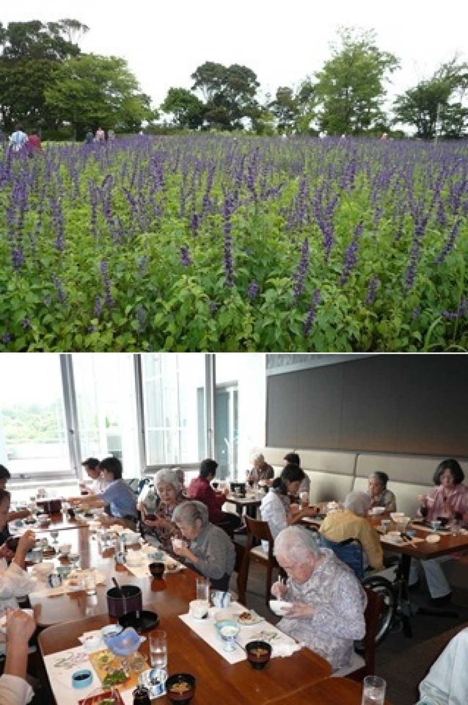 「特別養護老人ホームいずみの園」では年に1度、「すずめの家」との交流ドライブを行っています。 「すずめの家」とは、特養のご利用者が施設を出て地域でひと時を過ごすサービス(アウトデイ)で利用している家のことです。 今年は6月11日(月)に、第7回目の交流ドライブを行いました。ご利用者12名とすずめの家ボランティア8名と職員5名の計25名で、行き先は日出町にある海に面したハーブ園「大神ファーム」でした。 梅雨入りしたばかりでしたが天気に恵まれ、ゆっくりと園内を散策することが出来ました。バラやアジサイ、ラベンダー(写真上)などの花々が咲いており、みなさん花の名前を呼びながら鑑賞されていました。 昼食は近くにあるホテルで海を眺めながら頂きました(写真下)。とても美味しく、みなさん残さずきれいに召し上がりました。帰りの車の中でもみなさん楽しそうに交流されていました。 (特養事業部相談課) |