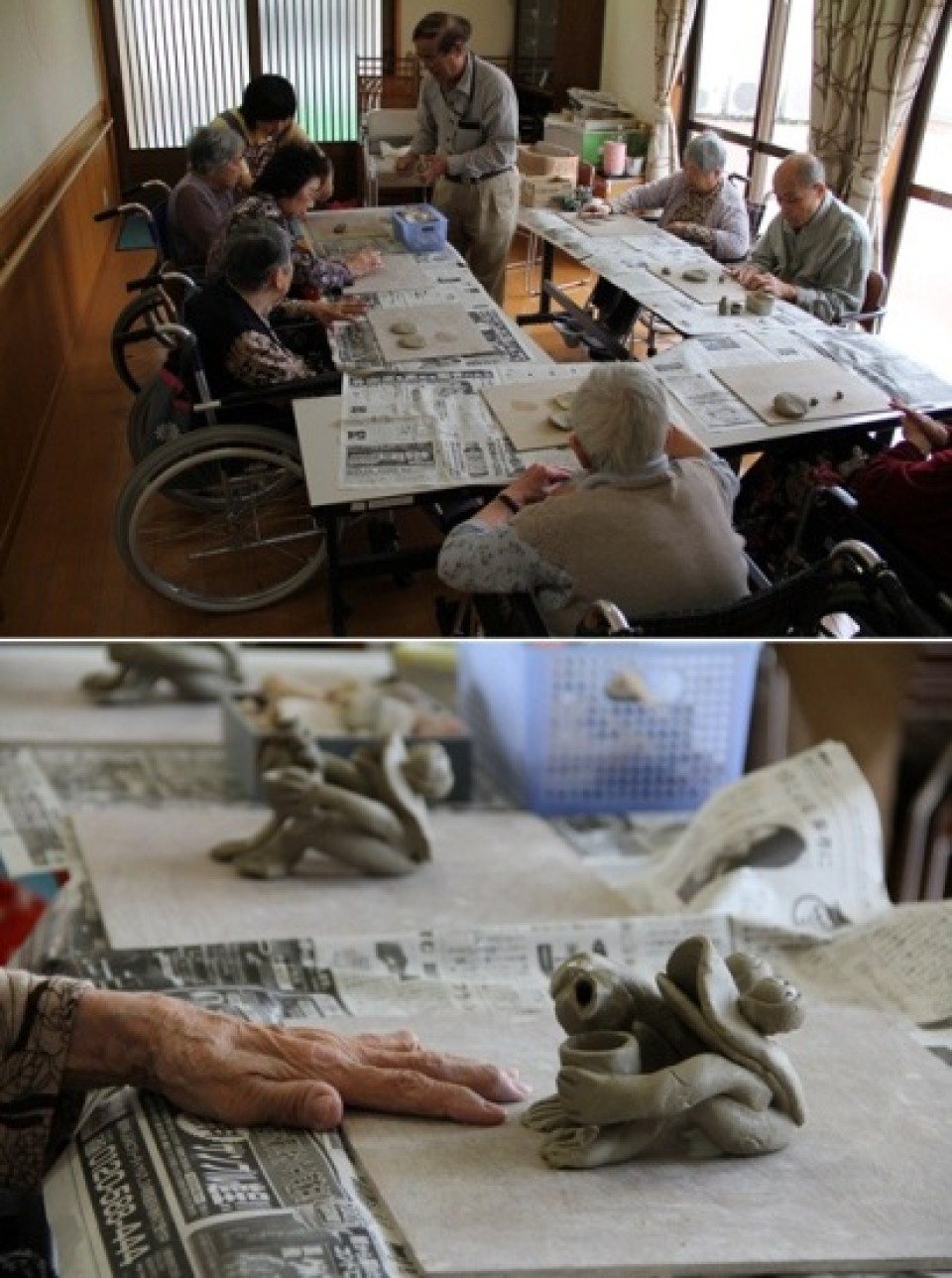 「特別養護老人ホームいずみの園」では、毎月1回陶芸教室を行っています。中津市内豊後町にあるかっぱ工房の方1名がボランティアで講師として来園され、ご利用者へ陶芸の指導を行って下さっています。 5月は23日(水)14:30より、特養ヨハネ館多目的ホールにて陶芸教室が行われ、特養ご利用者7名の方が参加され、職員1名が手伝いをしました。今回のお題はかなり難題の「酒のみカエル」の置物でした。講師が丁寧に指導してくれて、見本をみながら土をこね、約1時間後それぞれ個性のあるカエルが出来上がりました。 出来上った作品は、講師の方が持ち帰り、乾燥、素焼き、色付けなどをして、次の陶芸教室には出来上がりの作品が届けられます。 (特養事業部介護課) |