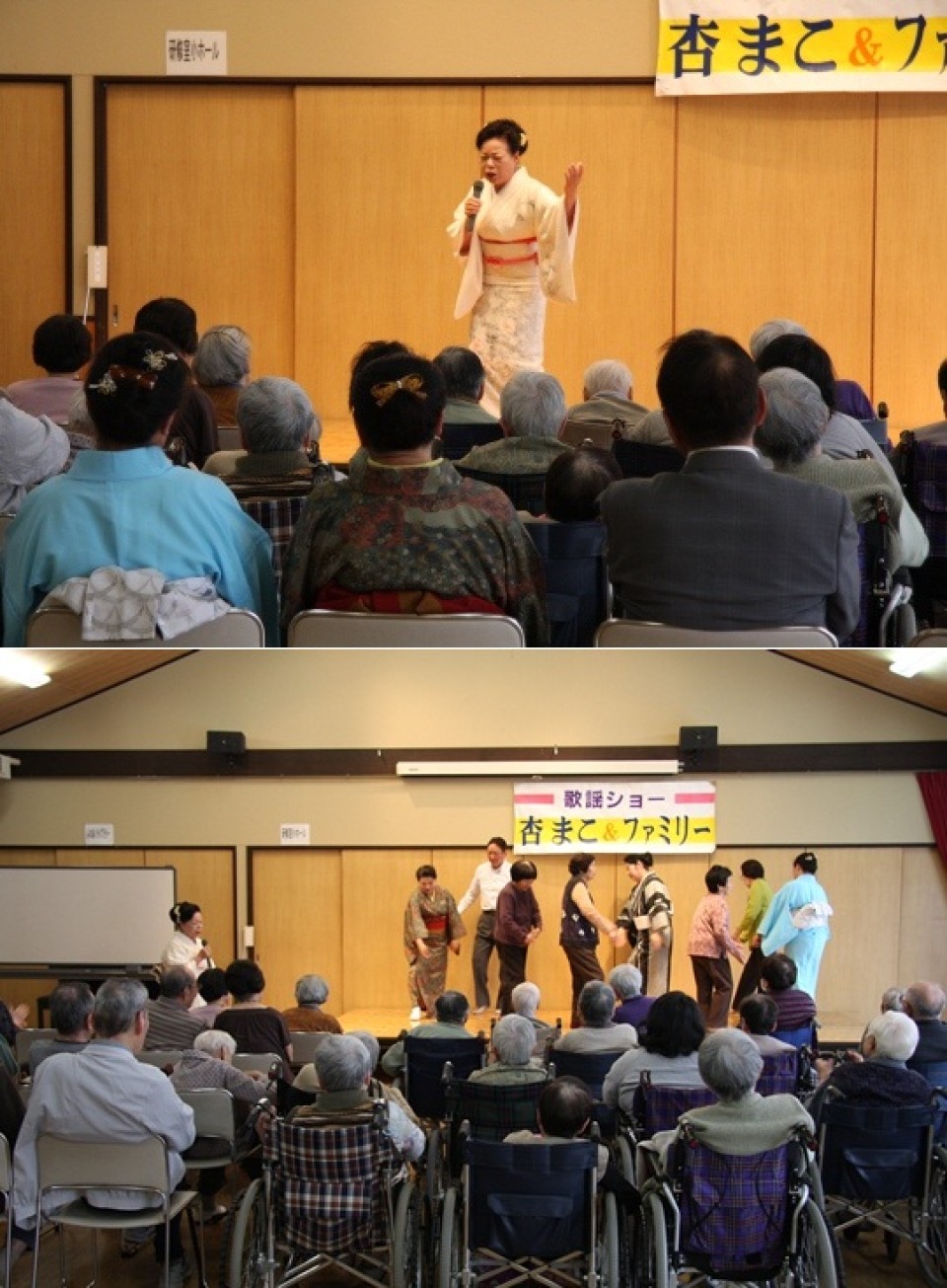4月18日(水)14:30より当園地域交流ホーム「いずみ館」において『杏マコ&ファミリー歌謡ショー』が行われました。 この行事は、毎年、ボランティアで歌や踊りを披露して頂いています。今年は20年目で、杏マコさんをはじめ9名の方が来られました。 特養、ショートステイ、デイサービスふれんど館、ケアマンション聖愛ホームのご利用者の50名の方々が集まり、昔懐かしい「青い山脈」「夫婦船」「飛車角」といった歌のメドレーや踊りにご満足いただいた様子でした。 最後に「おめでた音頭」の曲が流れ、ご利用者もステージに上がり、一緒に踊られ(写真下)、会場は大盛り上がりでした。 (特養事業部相談課) |
