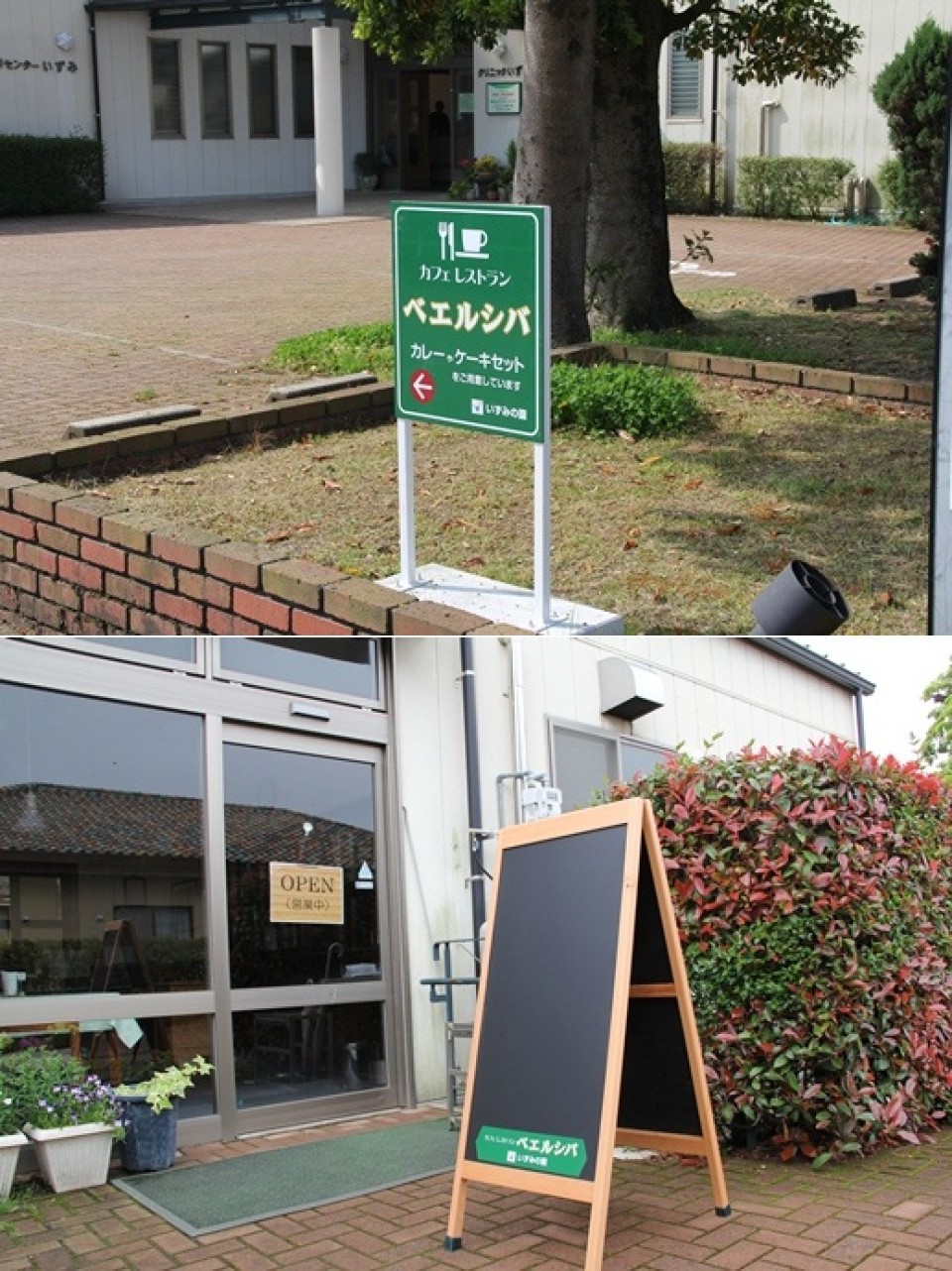 「いずみの園」敷地内には、カフェレストラン「ベエルシバ」があり、職員、ご利用者、ご利用者のご家族、面会に来られた方をはじめ、一般の方もご利用可能です。 この「ベエルシバ」の場所が分かり難いため、「クリニックいずみ」前の植え込みに看板を設置しました(写真上)。また、お店の前にメニューやお勧めなどが書けるボードの看板も置いています(写真下)。 「ベエルシバ」は「クリニックいずみ」、「リハビリセンターいずみ」と同じ建物にあります。 カレーなどの食事やケーキセットなどを用意していますので、どうぞご利用ください。 (経営企画室:編集担当) |