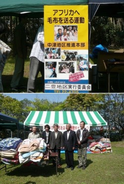 「いずみの園」では10年前から「アフリカへ毛布を送る運動」に、全職員を上げて協力しています。 1984年、アフリカで大干ばつが起こり、100万人以上の人々が命を落としました。グランド・ユニセフ事務総長は全世界に対し、毛布200万枚の緊急支援を呼びかけ、日本政府でも100万枚の毛布援助を表明しました。これが「アフリカへ毛布を送る運動」の始まりです。 今年も、「いずみの園」の職員へ呼びかけを行い、4月9日からの約20日間の間に、毛布51枚と輸送協力金176,000円が集まりました。 4月28日(土)、市内の田尻緑地公園で行われている「中津みなとふじまつり」の会場内において、当法人冨永理事長より、「アフリカへ毛布を送る運動」中津地区推進本部へ、毛布と輸送協力金を手渡しました。 (経営企画室:編集担当) |
