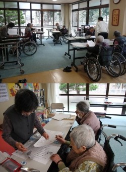 「特別養護老人ホームいずみの園」では特養のご利用者を対象に、「学習療法」を行っています。 「学習療法」とは、音読や計算、数字盤などの教材を用いて、学習するご利用者と支援者のコミュニケーションをとりながら行います。この学習を行うことで、老人性認知症の進行予防を目指しています。 月曜日から金曜日の毎日8時30分から約2時間、学校スタイルで、21名のご利用者が参加され3名の職員と、外部(ケアマンション聖愛ホーム)からのボランティアさんにもお手伝いいただき、楽しみながら行っています。 (特養事業部リハビリ課) |