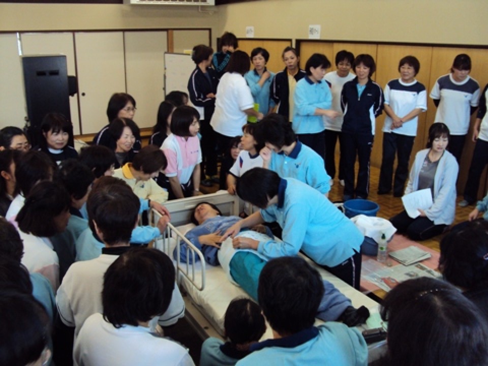 まず、清拭の目的を再確認し、陰部洗浄のビデオ学習を行い、その後利用者、介護者の役になりマニュアルに沿って実技研修を行いました。