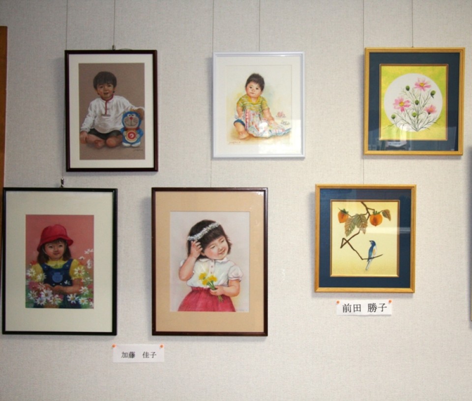 「いずみの園」本館内特別養護老人ホームのギャラリーに加藤佳子さんの色鉛筆画4点と前田勝子さんのちぎり絵2点を展示しています。