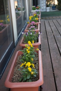 「ベエルシバ」の職員が、パンジー、なでしこ、ビオラ、金魚草をプランターに植え、レストランの横に並べ、水やりをし、大切に育てています。