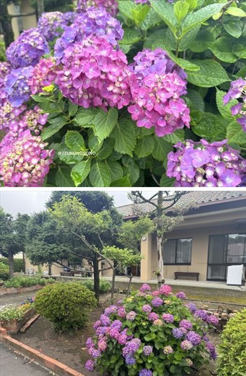 「いずみの園」の敷地にある紫陽花が綺麗に咲いています。 薄紫色からハッキリとしたピンク色の様々な種類の紫陽花があり、見る人の目を楽しませてくれます。