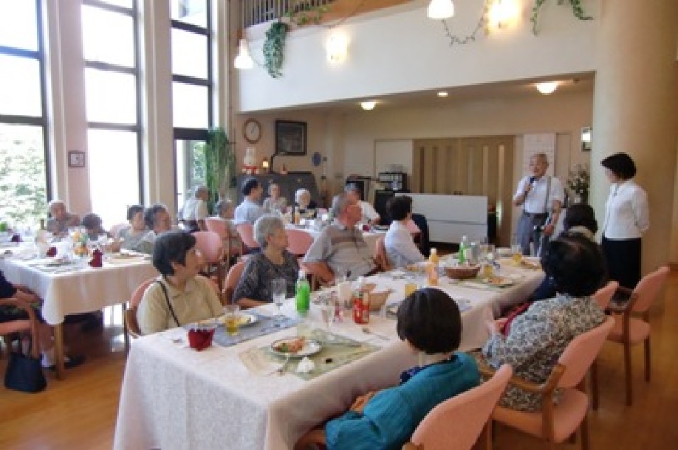 9月1日は、「ケアマンション聖愛ホーム」の開設記念日です。それに伴い、9月6日に開設16周年を記念して、開設記念礼拝と記念昼食会が行われました。 記念礼拝では当法人の多田理事長が開設16周年を感謝し、神様の祝福をお祈りしました。 礼拝後の記念昼食会は、「これからもみんな健康で、仲良く過ごせますように」とお祈りをしてから始まりました。 スパークリングワインで始まる洋食のフルコースです。料理、デザートはもちろん、パンまで手作りの、心のこもった15品を皆さんに楽しんでいただきました。いつもより少しおしゃれをし、生花やカラトリーでセッティングされた席に着くと今年もこの日を迎えられた喜びが沸いてきます。 「とてもおいしいです。」「一生懸命おもてなししてくれてありがとう。」とおほめの言葉をたくさん頂いて、私たち職員の方こそ感謝の気持ちでいっぱいになりました。 |